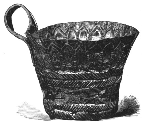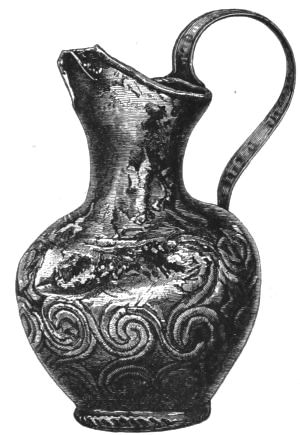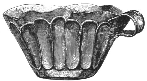 5. The goblet (No. 346 of the volume) has on each of its two handles, we are told, the carved figure of a dove in gold. Schliemann observes on the correspondence with the goblet of Nestor (Il. XI. 632-635). We are not indeed[xxiv] told that this was of gold; probably a different material is to be supposed from the mention of gold as the material of these parts or appendages. But it had four handles, and on each handle were two doves. We are also told that he did not get it in Troy, which may remind us of the argument already presented, but brought it from home. It was probably a foreign work; for the Phœnician associations of Nestor are attested by his descent from Poseidon (Od. XI. 254). This is fairly to be noted for an instance of equable development in art, as between the discoveries and the Poems.