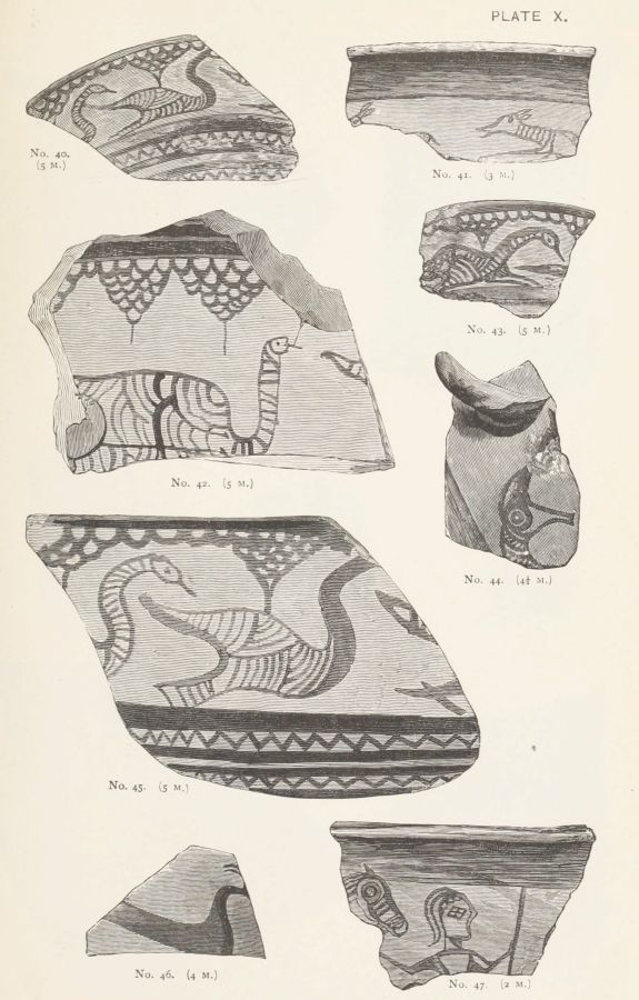 I gather from Mr. Gardner's report that the Art exhibited on the Pottery is more uniformly backward, than that exhibited by the works of metal. But this pottery, which was, whether wheel made or hand-made, of an early stage in the manufacture, was far more likely to be domestic; while the works in the precious metals might be imported. Or they might be the productions of foreign artists, attracted to the Court of Agamemnon; in the same manner as we find that Daidalos, whose name, however mythical, represents a foreign influence, executed in Crete, for Ariadne, the representation of a dance in metal.