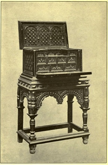 It was in the interesting time of William and Mary that the kneehole desk made its appearance. A certain enchanting clumsiness marks these desks from later products on the same line, and a decided flavour of Chinese construction. Such a desk was recently rooted out of the dark in an obscure Connecticut town, it having been brought over in the early days, and, not being mahogany, has lain despised by local dealers until one more "knowledgeable" than his fellows discovered that it was Elizabethan!