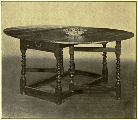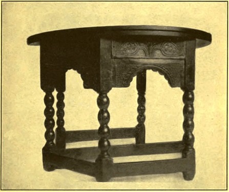 Tudor monarchs stop in 1603 at Elizabeth's death, but Tudor styles were not at once outgrown, rather they linger along far into the seventeenth century, heavily and elegantly regarding the newly throned Stuarts and their bewitching manners. The Tudor table, for instance, was a serious piece of furniture, put together as squarely and solidly as a house. Its enduring qualities are proved by the number of these tables still extant which, as refectory tables, are the smart thing for the dining-room of to-day. Bulbous legs with Italian carving, heavy square stretchers low on the ground, and draw-tops, are the distinguishing features. It is even suggested by the erudite that these tables are the last flicker of the style left by the Romans during their occupation of England, so like are they to pictured tables of Rome at that time.