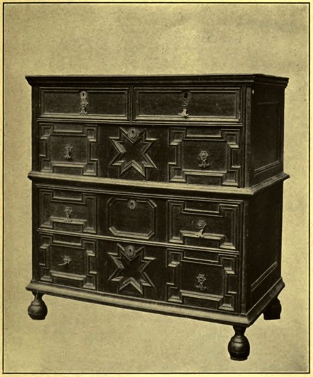 Knobs were needed as drawers appeared, and these were conveniently and logically made of wood, and were cut in facets like a diamond. But the prevailing metal mount for the rest of the century was the little drop handle that resembles nothing so much as a lady's long earring. It is found on old Jacobean cabinets, side-tables, and all pieces having drawers and cupboards. Its origin is old Spanish, and that smacks always of Moorish. With unusual fidelity this little drop handle clung until under Queen Anne (1703) the fashion changed to the wide ornamental plate with looplike handle, and that in turn served, with but slight variations, throughout the century.