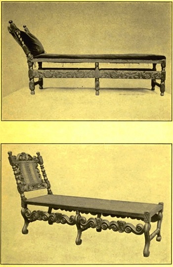 Happy indeed is the collector who can find such an old English sofa as that in the Metropolitan Museum on Plate 22. It is entirely characteristic, and shows not only the interesting fashion in carving, but the large advance in upholstering. Such comfortable work was unknown before the reign of Charles II. If we have curiosity as to the appearance of the gentlefolk who used such furniture, the embroidered cover of this piece shows lovely woman in her hours of ease, and mankind hovering near with a wish to please. But this very embroidery shows how difficult a matter it was for the English to draw with true hand and free, a purely decorative motive; for outside the figures of the medallions, the whole thing is meaningless and without consistency.