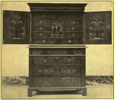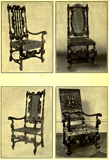 British styles were not yet to be let alone, for no sooner was the French way set than the Dutch pattern appeared, brought over by William and Mary. Delicately it came at first, giving place for hints from the court of Louis XIV, and then in full force by the time Anne took the sceptre in 1703. And all these styles imported throughout the seventeenth century, what were they but the several interpretations[ 8] of the Renaissance as it was expressed in France, Portugal, and Holland? Let not the student stagger under these complications of English styles, for although there are yet more reasons for the shapes and ornament of furniture in England during the seventeenth century they are all bright with incidents of kings and courts.