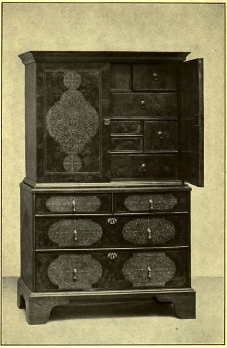 Varnish as we know it had never been in use, else had we missed the wonderful hand polish on old oak and walnut that cannot be imitated. And when it appeared it was only to use it in the Chinese manner, as a thick lacquer over painted or relief ornament. As the art of lacquering grew, cabinets of great elaboration became fashionable, and these were in many cases imported from China as the cunning handicraft of the Chinese exceeded that of the English in making tiny drawers and tea-box effects. Then these[ 54] pieces were sent to England where they were painted and lacquered by ladies as a fashionable pastime, and were set on elaborate carved stands of gilt in a style savouring more of Grinling Gibbons than of China,—which is the true accounting of the puzzling combination of lacquer and gold carving.