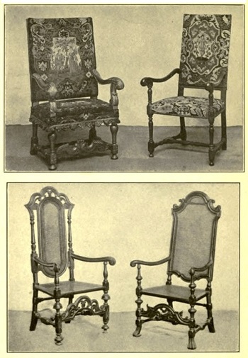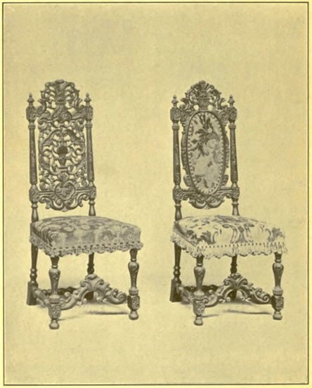 The shape of the leg in these finely carved chairs is to be noticed, as it is fathered by the chair-leg in vogue under Louis XIV in France, and in slight variations it prevails all through the William and Mary period. It is noticeable by a pear-shaped enlargement near the top. The Spanish foot is often seen on this style.