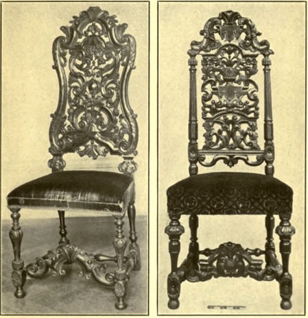 Among minor points of interest, those little points used by the amateur in identifying, is the marked change in the stretcher. Away back in the beginning[ 52] of the century, as seen on chairs and tables, it was heavy, made of square three-or four-inch oak, and placed almost on the ground. The first change was in using thinner wood; the next was in giving the stretcher a look of ornamental lightness by turning. When this happened the front stretcher of chairs was lifted from the ground to spare it the heavy wear apparent in older pieces. When carving attacked the stretcher, then it was placed well out of the way of harm, and it took on the ornamental effect of the chair's back. The Portuguese style of stretcher copied closely the carving on the top of the back in graceful curves.