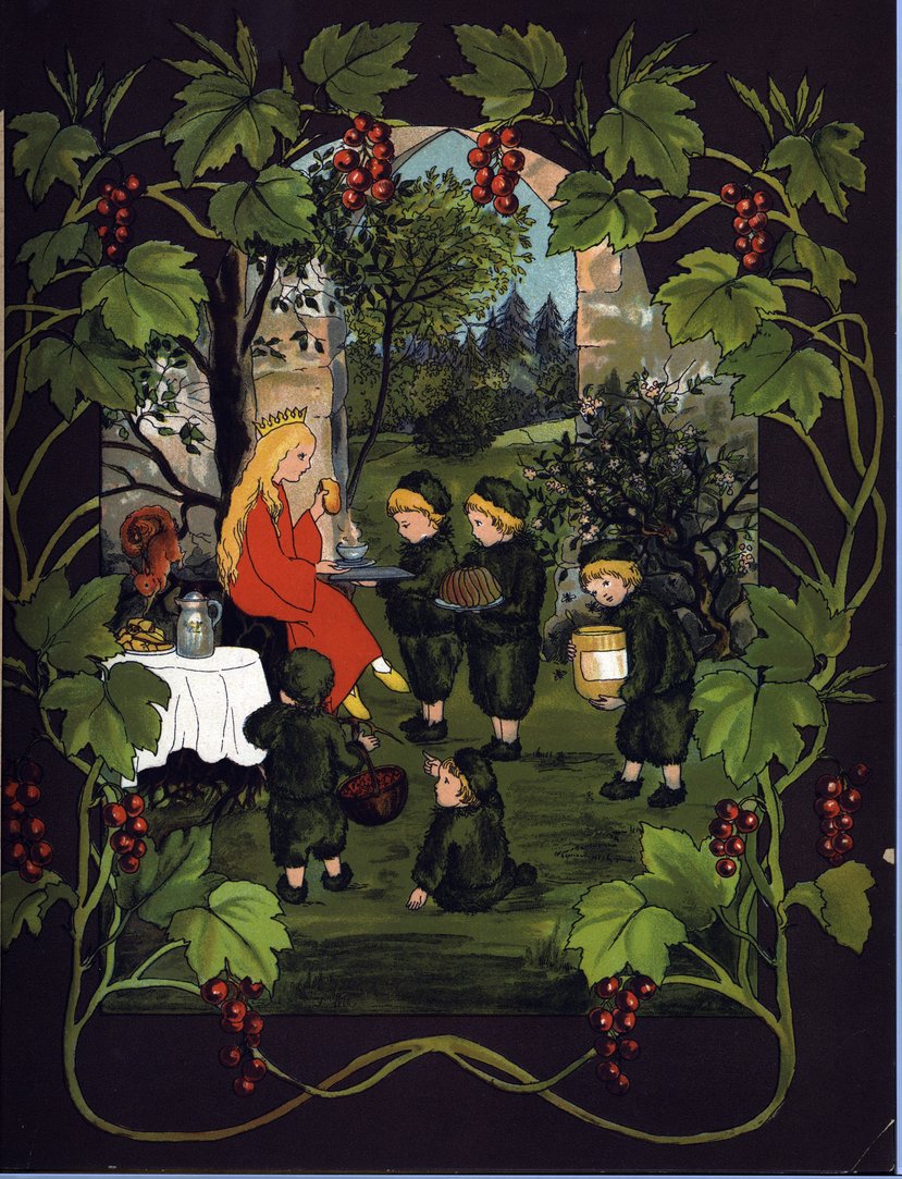 They led her to a little table spread on the roots of a tree in the castle garden, and made her a seat on a low branch. One brought her toast and warm milk, another moss-jelly, another honey and another sweet wild strawberries, gathered in the wood.
