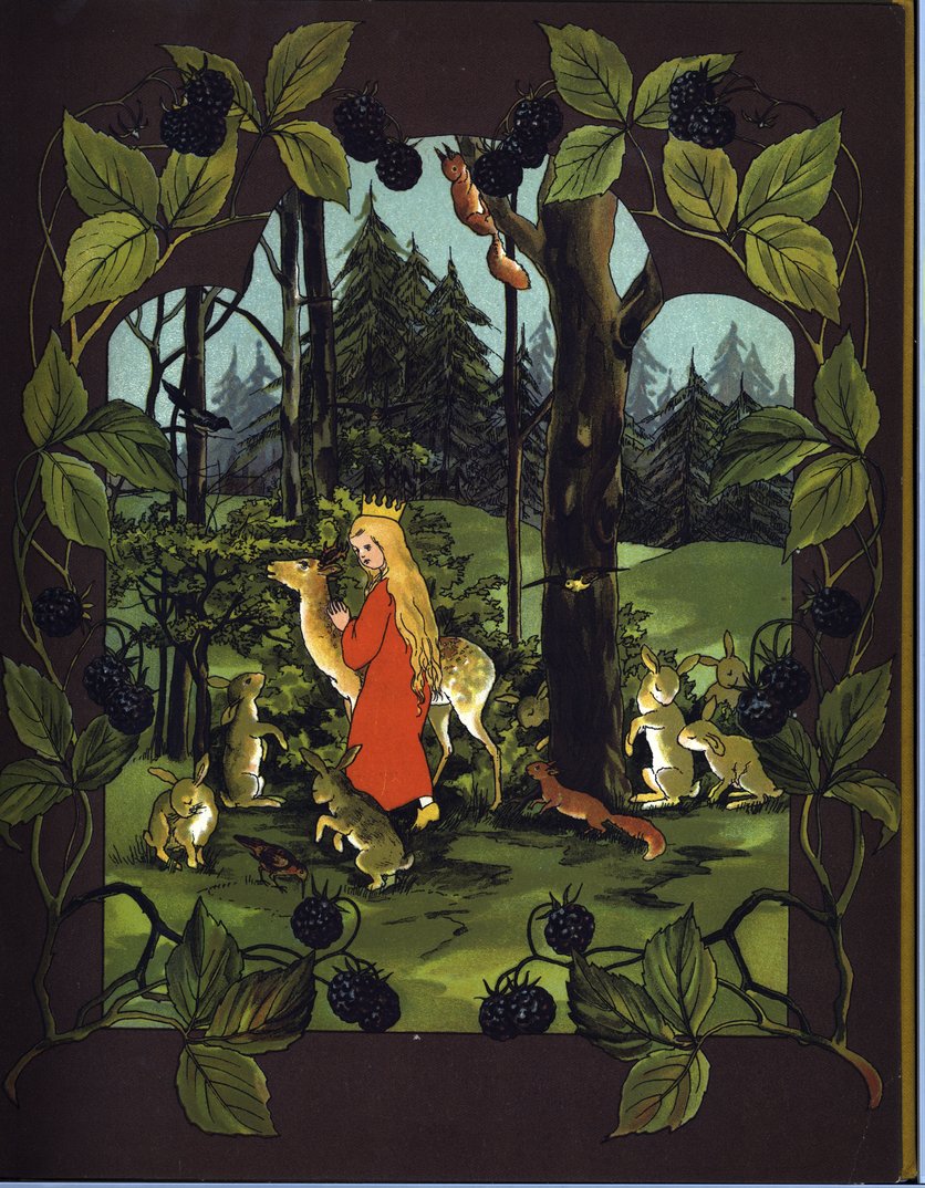When school was out, the little Princess wandered happily through the wood. A gentle fawn came springing over the lawn and walked beside her for a while. Seven frolicsome hares hopped and nibbled and played about the path. Whisk, the squirrel, and his mate followed too and stopped sometimes to eat a juicy blackberry. The birds flew and sang above them.