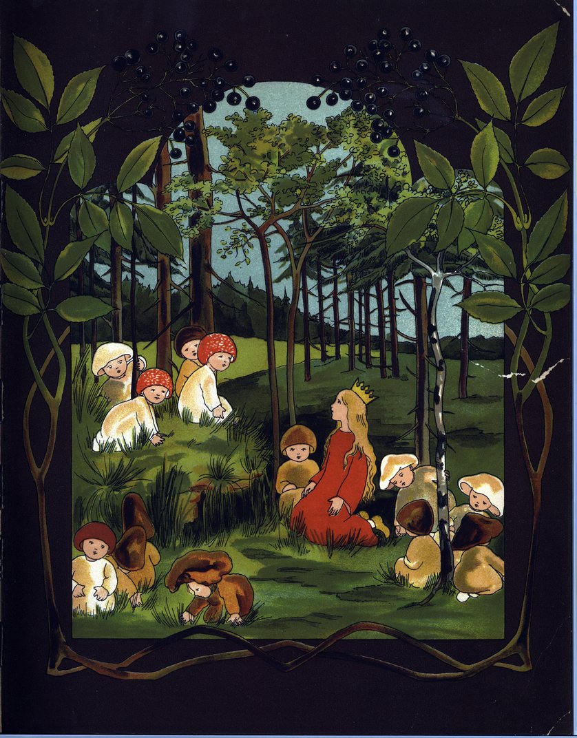When the sun grew warm the Dew Children vanished away, and five little Moss-boys scampered up and begged the Princess to share their breakfast. The Moss-boys’ names were Evergreen, Moss-cap, Velvet, Soft-step and Green Jacket.