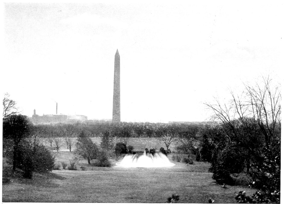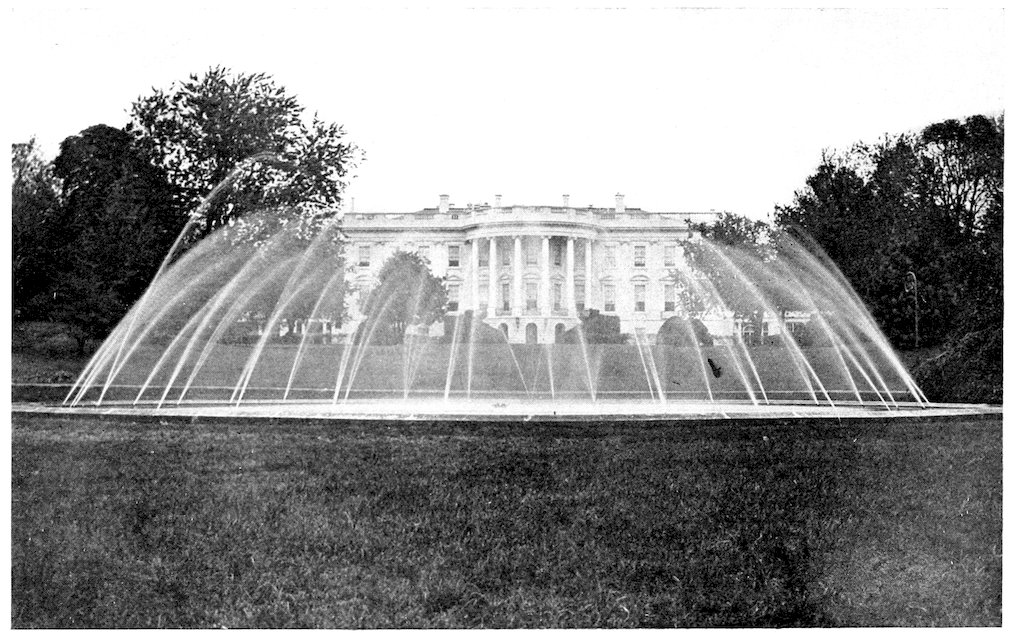 It was a night garden party with such illuminations as are quite beyond description. Every tree and bush was ablaze with myriads of tiny coloured lights, the whole stately mansion was outlined in a bright white glow; there were strings of bobbing, fantastic lanterns wherever a string would go; 392the great fountain was playing at its topmost height in every colour of the rainbow; while on the gleaming point of the Monument and on the flag stretched in the breeze from the staff on the top of the White House shone the steady gleam of two searchlights.