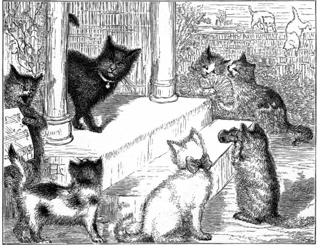 In my last letter I told you about the new black cat, Cæsar, who had come to live in the Nelson house, and how anxious I was to know him. As soon as my nose was fit to be seen, Judge Dickinson's cat, who is a good, hospitable old soul, in spite of her stupidity, invited me to tea, and asked him too. All the other cats were asked to come later in the evening, and we had a grand frolic, hunting rats in the Judge's great barn. Cæsar