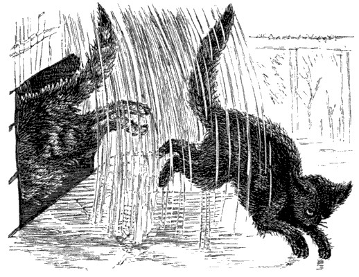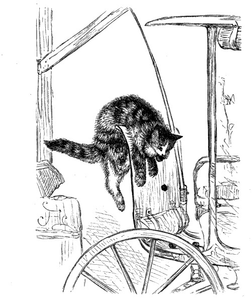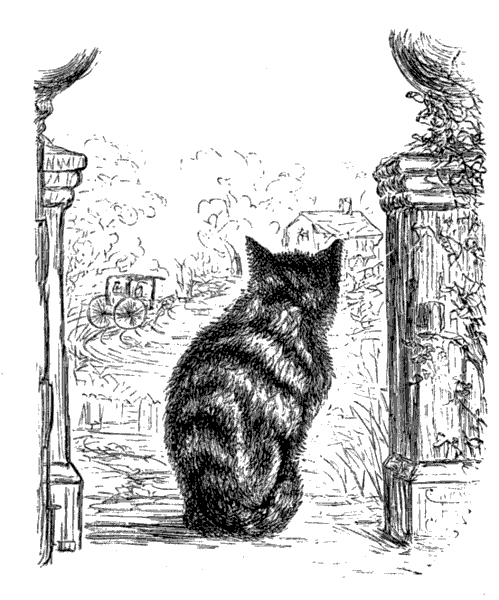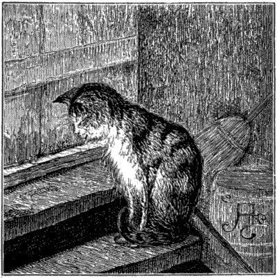 It went on from bad to worse for three more days after I wrote you. Your mother did not come home; and the awful Irishwoman was here all the time. I did not dare to go near the house, and I do assure you I nearly starved: I used to lie under the rose-bushes, and watch as well as I could what was going on: now and then I caught a rat in the barn, but that sort of hearty food never has agreed with me since I came to live with you, and became accustomed to a lighter diet. By the third day I felt too weak and sick to stir: so I lay still all day on the straw in Charlie's stall; and I really thought, between the hunger and the anxiety, that I should die. About noon I heard Mary say in the shed, "I do believe that everlasting cat has taken herself off: it's a good riddance anyhow, but I should like to know what has become of the plaguy thing!"