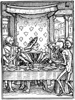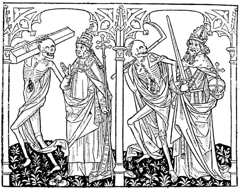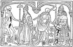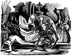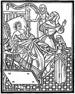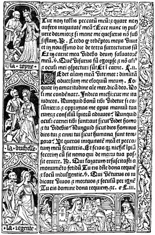 We can see what developments this theme could lend to the mysticism of the fifteenth century. Composed in eleven designs, the Ars Moriendi ran up to eight different editions. From the middle to the end of the fifteenth century, the text was in Latin, then in French, under the title L'Art au Morier. In the French edition will be found the blocks that served for the second impression of the work. About 1480, more than fifty years after the first essays, the Ars[9] Moriendi enjoyed so much vogue that it employed all the resources of typography as much as in its earliest days. The original subjects, copied in a very mediocre manner, adorned the text, which was composed in Gothic letters, with a new and more explicit title: Tractatus brevis ac valde utilis de Arte et Scientia bene moriendi (4to, s.l.n.d.), but the order is inverted, figure 5 of the xylograph becoming No. 3 of the edition of 1480.