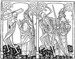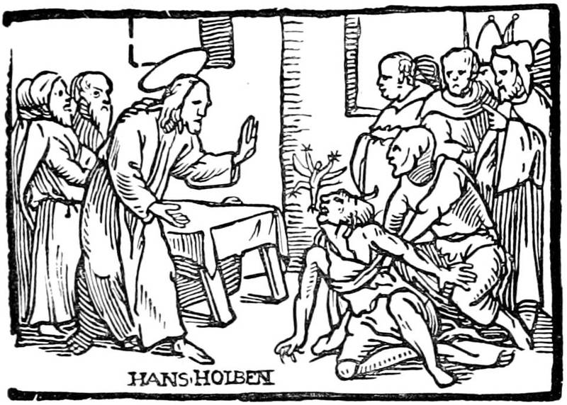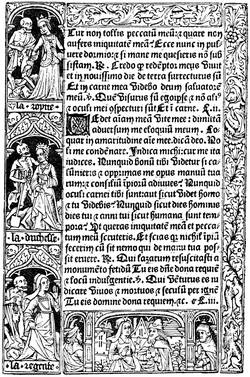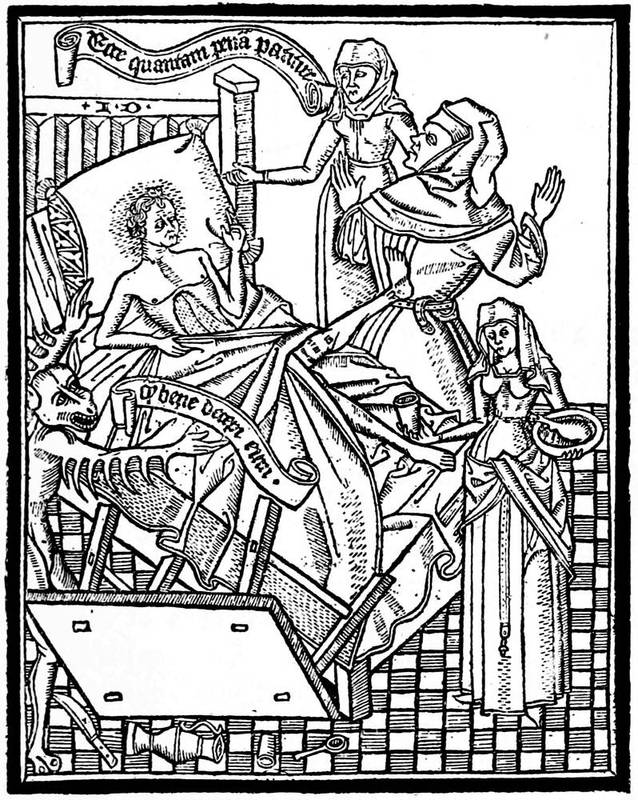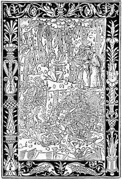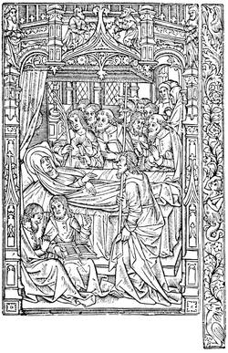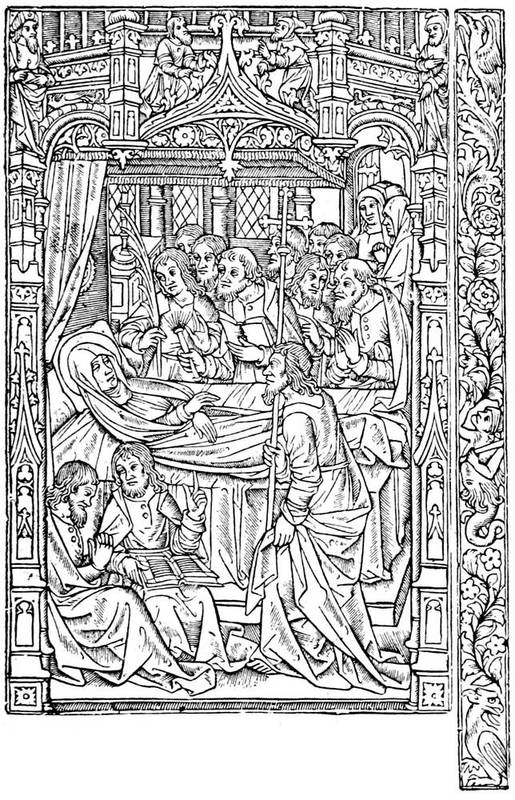 All the xylographic works of the fifteenth century may be classed in two categories: the xylographs, rightly so called, or the block books, such as the Donatus, and the books with movable types, like the Speculum, of which we speak. This mystic and simple literature of pious works for the use of people of modest resources found in printing the means of more rapid reproduction. Then appeared the Biblia Pauperum, one of the most celebrated and the most often reproduced, and the Ars Moriendi, a kind of dialogue between an angel and a devil at the bedside of a dying person, which, inspired no doubt by older manuscripts, retained for a long time in successive editions the first tradition of its designs. On labels displayed among the figures are found inscribed the dialogue of the demons and angels seeking to attach to themselves the departing soul, the temptations of Satan on the subject of faith, and the responses of the angel on the same subject.