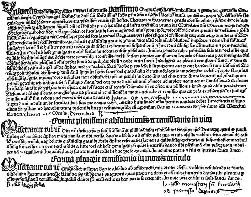 It is not without interest, for the history of the Book and of printing, to note here that these letters of indulgence, the clandestine traffic in which was largely accelerated by rapidity of production and the small cost of each copy, formed one of the causes of the religious reform of Martin Luther. They afforded a means of raising money, and were so generally resorted to that in the register of the Hotel de Ville of Paris preserved in the Archives Nationales (H 1778) it may be seen that the sheriffs requested the Pope to allow them to employ them in the reconstruction of the bridge at the Hotel de Ville.