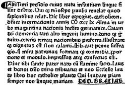 In spite of his disappointments, Gutenberg did not rest idle. If he had seen his two enemies rob him of his claim of priority in the invention, he had to show that, reduced to his own exertions and to the restricted means furnished him by charitable people, he also could print well. Two years after the Bible a dated book, composed in Gothic letters, appeared at Mayence; this was the Catholicon of John Balbus, of Genoa. It had not yet occurred to these first printers to exercise their art otherwise than on religious works. It is admitted by general opinion that the Catholicon issued from the press of Gutenberg; on the other hand, M. Bernard believes that it ought to be attributed to a printer of Eltvil, who published in 1467 a vocabulary called the Vocabularium ex quo with the same types. The former theory may be sustained by the words of the colophon of the book, which is a sort of hymn to God and a recognition of the city of Mayence without any mention of the name of the printer. Now in the situation in which Gutenberg found himself, in the face of his rivals, had he not some claim to regard[24] the great discovery as his own? But if M. Bernard is mistaken, and if our supposition has no foundation, what a beautiful act of humility, what a noble idea of his character, Gutenberg gives us in writing, "With the aid of the Most High, Who releases the tongues of infants and often reveals to babes that which is sealed to learned men, this admirable book the Catholicon was finished in the year of the incarnation of our Saviour MCCCCLX. in the mother-country of Mayence, famous city of Germany, which God, in His clemency, has deigned to render the most illustrious and the first of cities; and this book was perfected without the usual help of pen or style, but by the admirable linking of formes and types"!