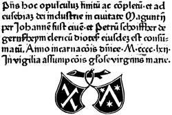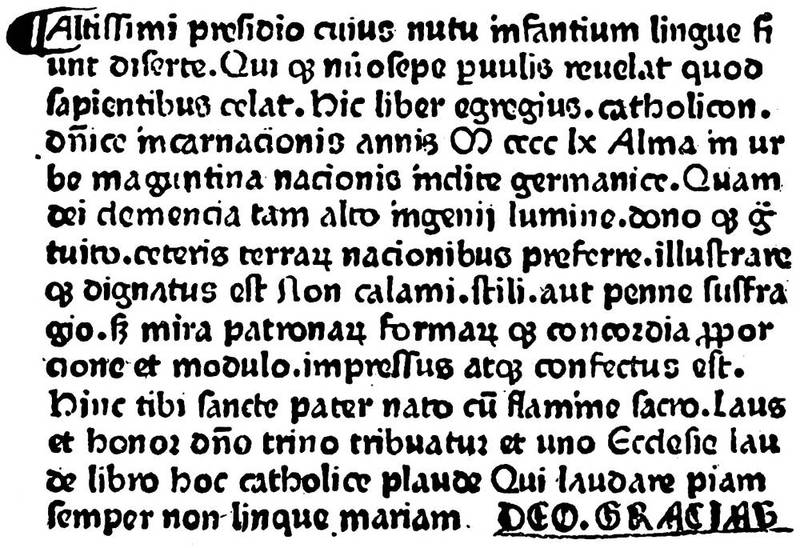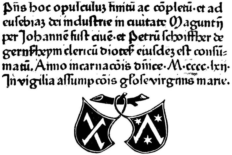 Fig. 7.—Colophon of the Bible printed in 1462 by Fust and Schoeffer, which is the first dated Bible. There are two different editions with this signature. The above is from the second edition.