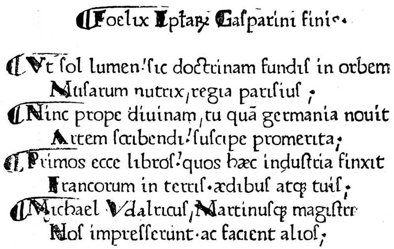 As to Gutenberg, we have not been able to go as far as M. E. Dutuit, who in his Manuel a'Estampes (vol. i., p. 236, etc.) doubts Gutenberg's right to the title of inventor. It is stated that in a letter of William Fichet,[31] prior of the Sorbonne, of whom we shall have more to say presently, to Robert Gaguin, which M. A. Claudin found at the beginning of a work entitled Gasparim Pergamensis orthographiæ liber, published in 1470, nearly twenty years after the first work at Mayence, Gutenberg is proclaimed the inventor of printing. Without any other, this testimony of a savant who was the first to bring the German printers to Paris appears to us well nigh irrefutable.