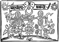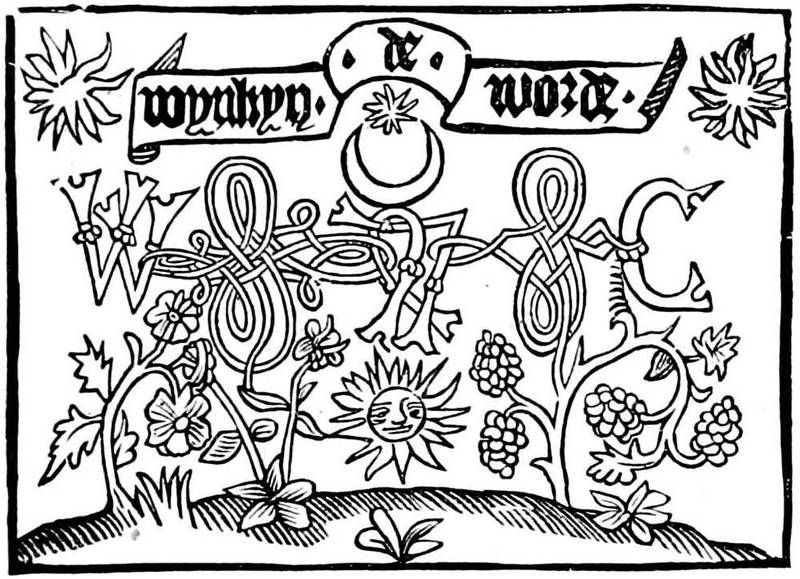 - Wynken de Worde, early English printer, 37, 95.