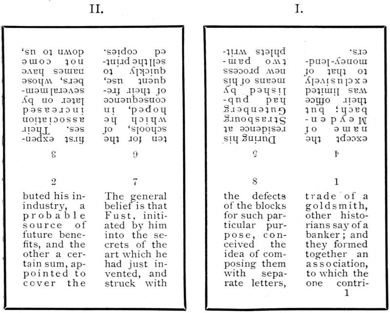 A legal document discovered in 1760 by Wencker and Schoepflin in the Pfennigthurm of Strasbourg, and afterwards translated into French by M. Leon de Laborde, makes us at length acquainted with the work of Gutenberg and of his associates Andrew Dritzehen and Andrew Heilmann. Apparently these three men were, as we have said, Spiegelmacher, that is makers of mirrors. They had jointly entered into a deed by the terms of which, if one of the partners died in the course of their researches, his heirs would have no[14] rights beyond an indemnity corresponding to the amount invested by him. It happened that Andrew Dritzehen did die, and that one of his brothers aspired to occupy his place in the partnership. The dead man left debts behind him; he had squandered his florins by hundreds in his experiments. Gutenberg having offered to pay the amounts expended, the heirs of Dritzehen, who wanted more, summoned him before the courts to show why he should not make place for them in the work of experiments and making of mirrors. The witnesses in their testimony before the court told what they knew of the inventions of the partnership. One among them deposed that after the death of Dritzehen, Gutenberg's servant went to the workshop and begged Nicholas Dritzehen, brother of the deceased, to displace and break up four formes placed in a press. A second testified that the works of Andrew had cost him at the least three hundred florins, an enormous sum for those days. Other witnesses painted Gutenberg in a curious light: they made him out to be a savage, a hermit, who concealed from his associates certain arts of which the deed stipulated nothing. One fact proved that the experiments referred to the manufacture of metallic characters. A goldsmith, named Dünne, maintained that he had received more than a hundred florins for printing material "das zu dem trucken gehoret." "Trucken!"—"Typography!" The word was found, and from that day usage has consecrated it.