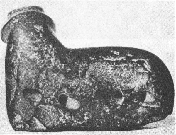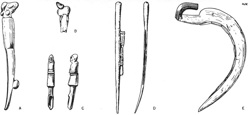 - 1C. Upper part of bone sickle haft with end carved in form of human figure and groove, 12.8 cm. long, from Sialk in Persia (R. Ghirshman, Fouilles de Sialk, Vol. I [Paris, 1938], Plate LIV, 1)