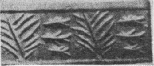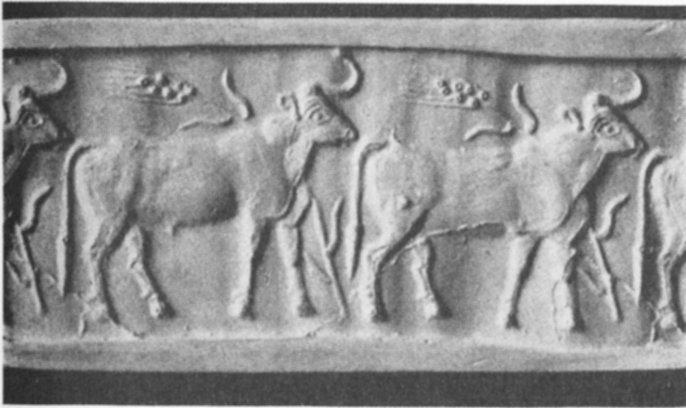 - 14. Impression of a cylinder seal of the Protoliterate period showing bulls and ears of barley (Frankfort, Cylinder Seals [London, 1939], Plate Vb)