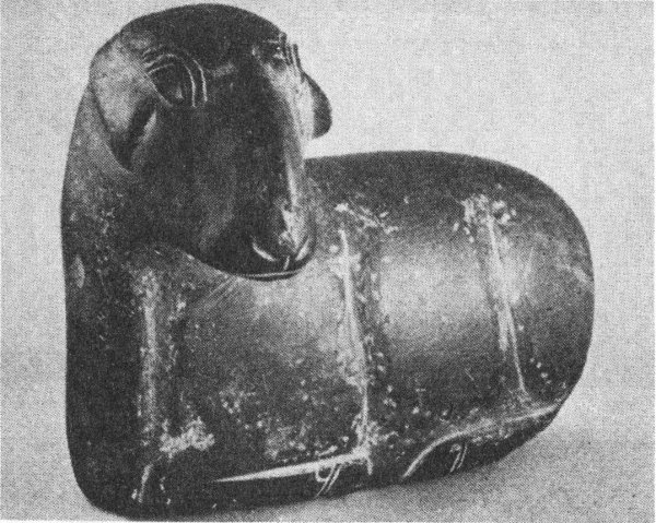 - 17-18. Front and back of the stone figure of a ram in the Babylonian Collection, Yale University (Courtesy of Yale University Art Gallery), length 21.8 cm., height 15.8 cm.