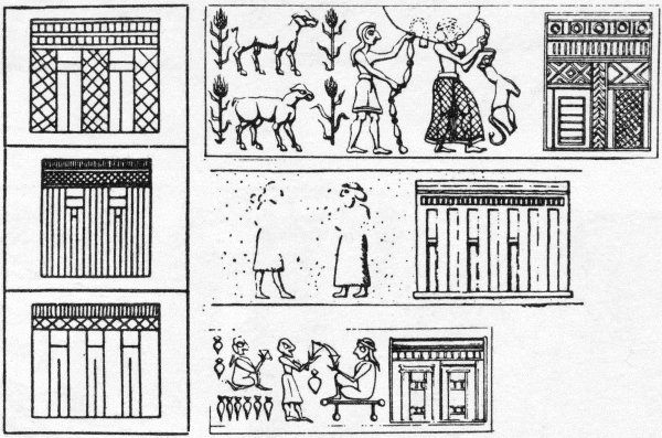 - 44. Three buildings with recesses, rendered on monuments of the First Dynasty in Egypt, and three Mesopotamian cylinder-seal impressions of the Protoliterate period (American Journal of Semitic Languages and Literatures, LVIII [1941], Plate 341, Fig. 7)