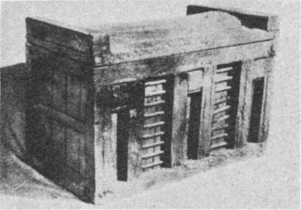 - 49. Wooden coffin imitating a recessed building with round wooden beams, from Tarkhan (Petrie, Tarkhan, I, Plate XXVIII)