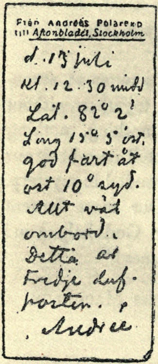 “13th July, 12.30 p.m., 82.2° N. L., 15.5° E. Long. Good progress towards the north. All goes well on board. This message is the third brought by a pigeon.—Andrée.”