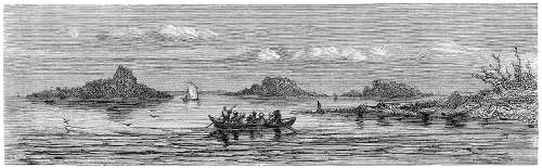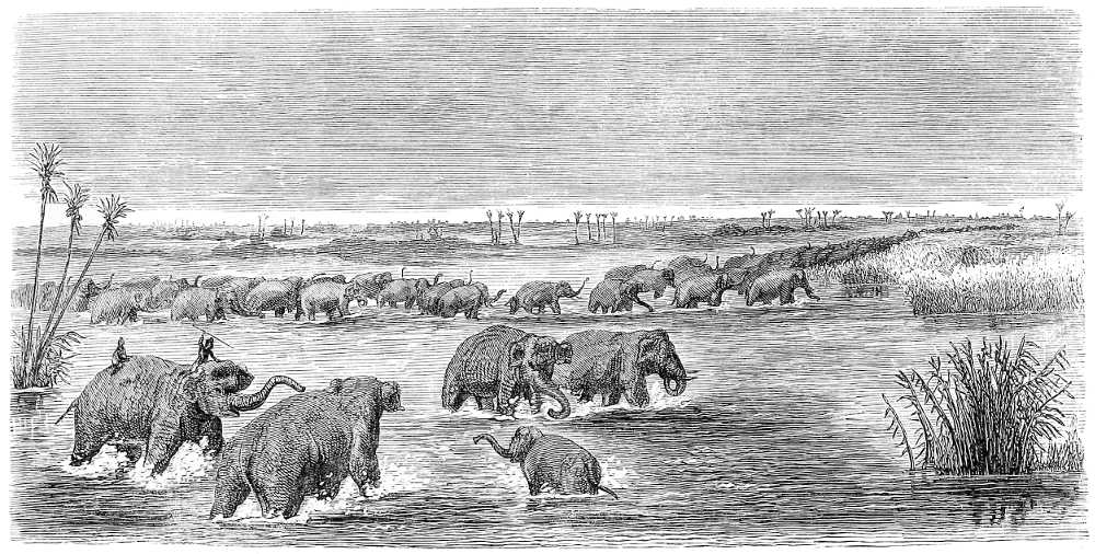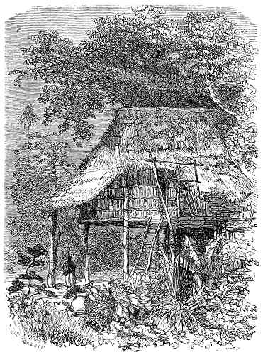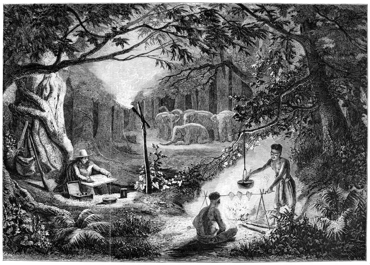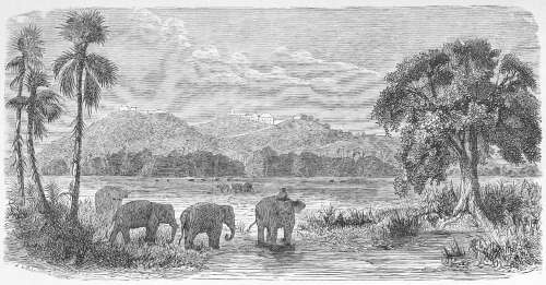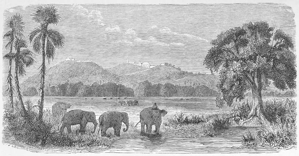 The Mekon is a vast melancholy-looking river, three miles broad, covered with islands, and flowing with the rapidity of a torrent. Its shores are covered with aquatic birds, but its waters are almost deserted by canoes.[14] A plain covered with coarse herbage separates it from the forest by which Cambodia is overspread, and which can rarely be traversed except by cutting a way. That forest is exceedingly unhealthy.