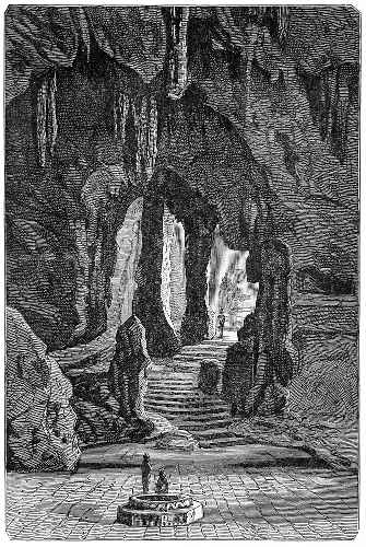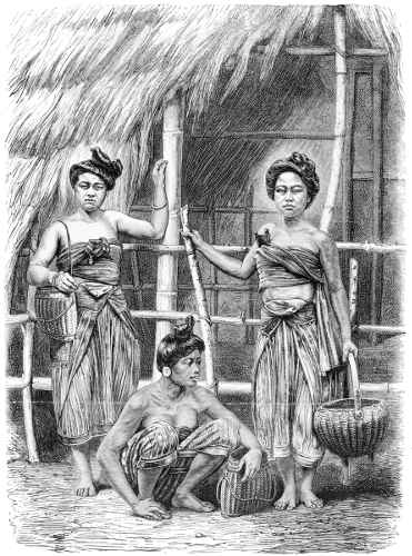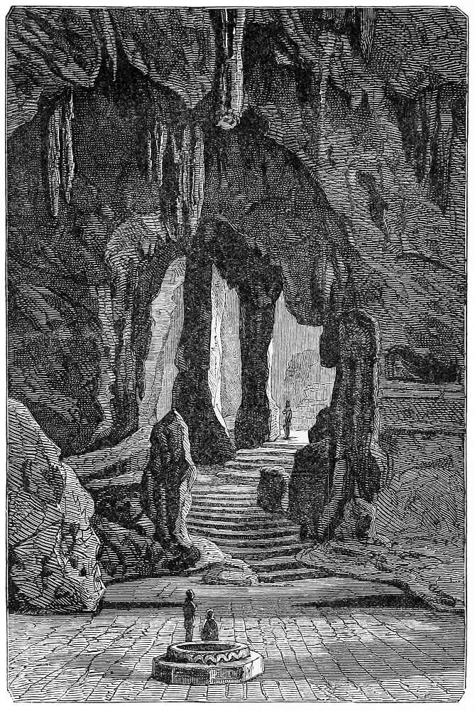 On the exterior of the wall, which on one side sustains[4] the high roof, are a series of bas-reliefs, surrounding the whole gallery. They are sculptured in the thickness of the wall, and are curious from the scenes and costumes they represent. These scenes are drawn more from the sacred books of the people than from their history; for men with ten heads and twenty arms, fantastic animals, griffins and dragons, are favourite subjects. The men all wear the langouti, and often nothing beside, and have the ears pierced and hanging on their shoulders: many have long beards.