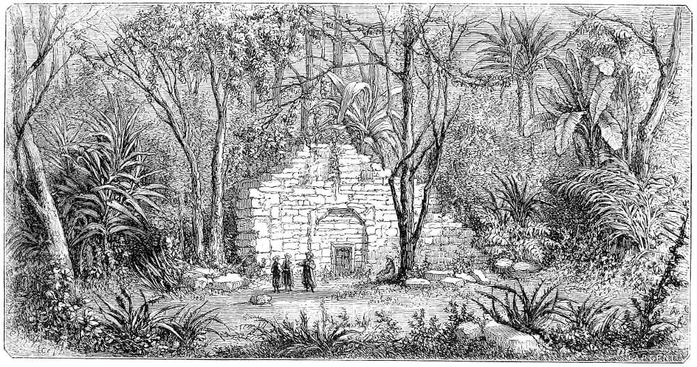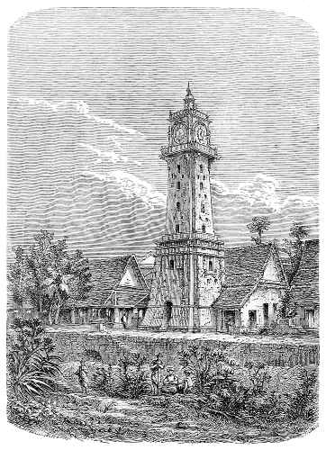 These remains are in a tolerable state of preservation, and are composed of a central tower, 18 metres high, surrounded by four turrets, and flanked by two other towers connected together by galleries. At the top are four immense heads in the Egyptian style; and every available space is filled with sculpture. At the foot of the great tower is a passage for carriages; and on each side of it are doors and staircases communicating with the walls, the whole building being constructed of sandstone.[2] The outer wall is composed of blocks of ferruginous stone, and extends right and left from the entrance. It is about 24 miles square, 3 met. 80 centimet. thick, and 7 met. high, and serves as a support to a glacis which rises almost from the top. At the four cardinal points are doors, there being two on the east side. Within this vast enclosure, now covered with an almost impenetrable forest, are a vast number of buildings, more or less in ruin, which testify to the ancient splendour of the town. In some places, where the heavy rains have washed away the soil, or where the natives have dug in search for treasure, may be seen immense quantities of porcelain and pottery.