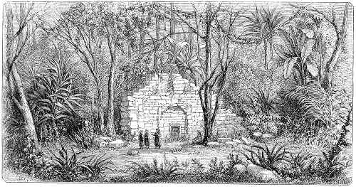 Three walls at some distance from each other, and each bounded by a moat, surround what remains of the palace of the ancient kings. Within the first enclosure are two towers connected by galleries, which form four sides, like a triumphal arch. The walls are of ferruginous stone, and the length of each block forms the thickness of the wall. The towers and galleries are of sandstone.