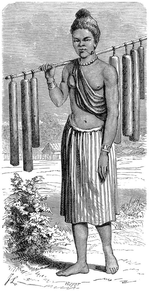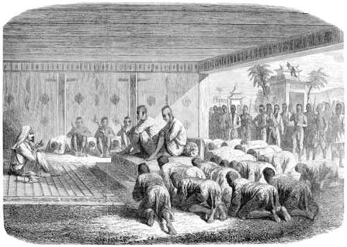 In another part is a long procession: the king is in a large open carriage, divided into three compartments, he being in the centre one, and his wives in the two others. This carriage has six wheels and two shafts, which rest on the shoulders of eight men. The chiefs are mounted on elephants or horses, or seated in carriages drawn by four led horses, and by their side march a numerous company bearing standards, parasols, and caskets.