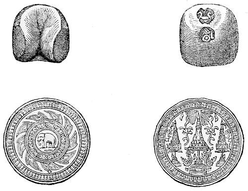 Subsequently the author visited the large Buddhist ruins of Ongcor, of which he has brought back numerous sketches. He[297] speaks of the mineral wealth of Cambodia—its iron, gold, lead, and copper. In the islands of Phu-Quoc or Koh Tron, belonging to Cochin China and near to Komput, there are rich mines of coal, similar to our Cannel coal, from which ornaments are made. Several extinct volcanoes exist in Pechaburi, of heights not exceeding 2000 feet above the sea-level, and there are two active ones in an island called Ko-man, lat. 12° 30′, long. 101° 50′, in the Gulf of Siam.