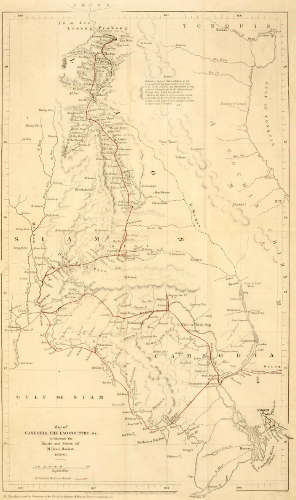 M. Mouhot traversed Cambodia from east to west, and also ascended the Mekon river to the frontier of Laos. He returned to the coast by crossing the water-parting between it and the basin of the Menam river, and descending to Bangkok.