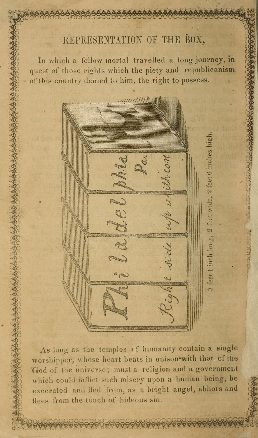 At length, after praying earnestly to Him, who seeth afar off, for assistance, in my difficulty, suddenly, as if from above, there darted into my mind these words, “Go and get a box, and put yourself in it.” I pondered the words over in my mind. “Get a box?” thought I; “what can this mean?” But I was “not disobedient unto the heavenly vision,” and I determined to put into practice this direction, as I considered it, from my heavenly Father.[9] I went to the depot, and there noticed the size of the largest boxes, which commonly were sent by the cars, and returned with their dimensions. I then repaired to a carpenter, and induced him to make me a box of such a description as I wished, informing him of the use I intended to make of it. He assured me I could not live in it; but as it was dear liberty I was in pursuit of, I thought it best to make the trial.