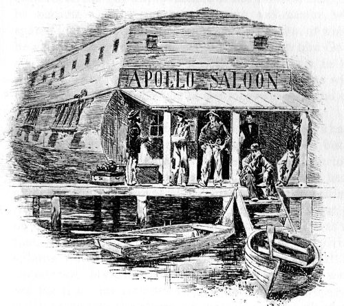 [33] Dancing was a common amusement among the miners even when there were no women to be had as partners. “It was a strange sight to see a party of long-bearded men, in heavy boots and flannel shirts, going through all the steps and figures of the dance with so much spirit, and often with a great deal of grace; hearty enjoyment depicted on their dried-up, sun-burned faces, and revolvers and bowie-knives glancing in their belts; while a crowd of the same rough-looking customers stood around, cheering them on to greater efforts, and occasionally dancing a step or two quietly on their own account.”—Borthwick’s “Three Years in California.”