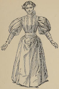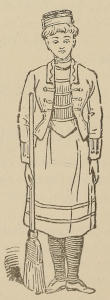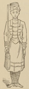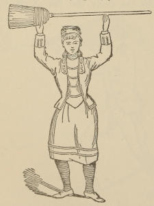 A very large shoe, which she has just vacated, is on the floor beside her. The other, her face and attitude showing keenest disappointment, has just put on her shoe. These shoes, while nicely made, should be the largest that can be had. The slipper may be of white satin, small and handsome.