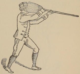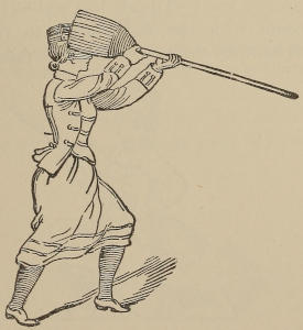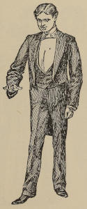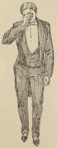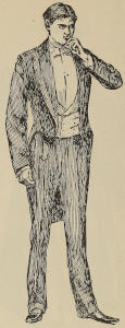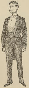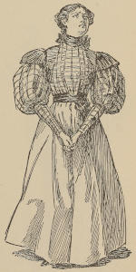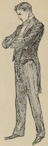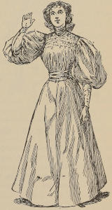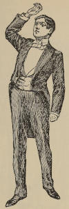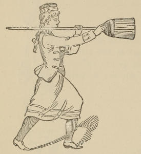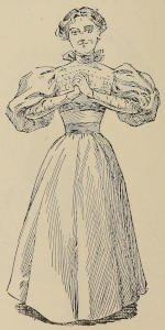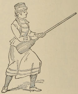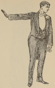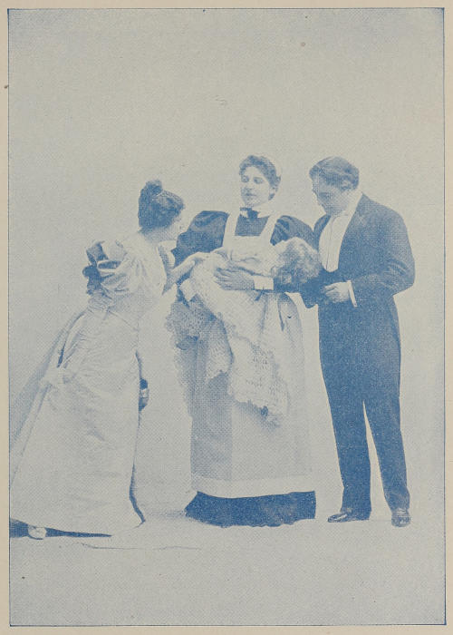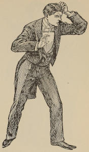 The scene is a parlor.—Standing in the foreground is a young girl, simply dressed. In her left hand she has a rose, and holding out her right hand shows to her companion the scratches made by the thorns (a little carmine paint, put on with a fine camel’s-hair pencil, makes very painless scratches.) Her companion, a young man dressed as a mechanic’s apprentice (a carpenter’s, butcher’s, shoemaker’s or any other trade), is, with a look of sympathy, raising the wounded hand to his lips. Behind the young man stands his employer, with an expression of rage, raising a rope about to strike the apprentice. He is not perceived by either of the young people.