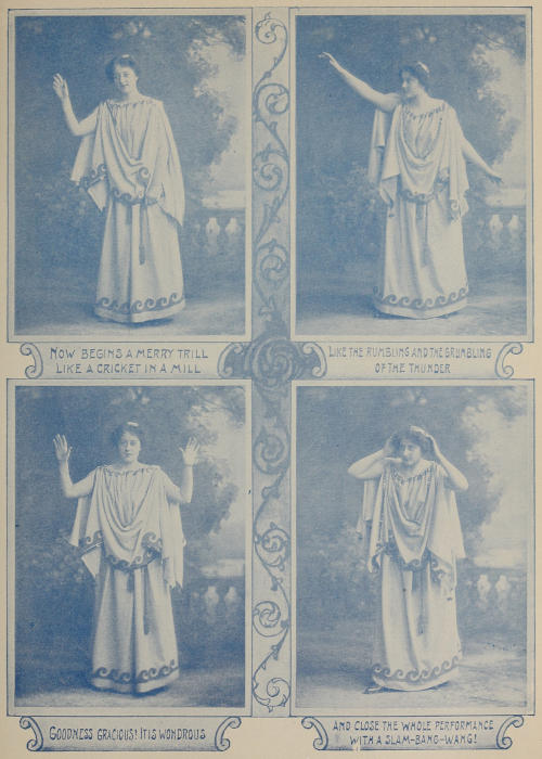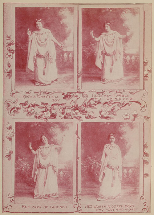All the Typical Gestures used in Reciting are shown by choice engravings, and the reader has in reality the best kind of teacher right before him. The different attitudes, facial expressions and gestures are both instructive and charming. These are followed by Recitations with Lesson Talks. Full directions are given for reciting the various pieces, and this is done by taking each paragraph or verse of the selection and pointing out the gestures, tone of voice, emphasis, etc., required to render it most effectively. The Lesson Talks render most valuable service to all who are studying the grand art of oratory.