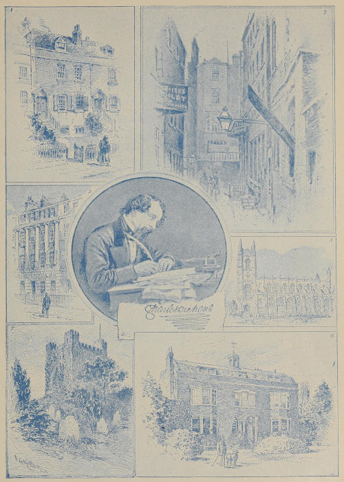 1. THE BIRTHPLACE OF CHARLES DICKENS, COMMERCIAL ROAD, PORTSEA. 2. THE “DARK COURT” IN FLEET STREET, (JOHNSON’S COURT) WHERE DICKENS POSTED HIS FIRST SKETCH. 3. THE HOUSE IN FURNIVAL’S INN WHERE “PICKWICK” WAS WRITTEN. 4. CHARLES DICKENS EDITING “HOUSEHOLD WORDS.” 5. THE CHURCH IN WHICH DICKENS WAS MARRIED, ST. LUKE’S, CHELSEA. 6. GAD’S HILL PLACE, ROCHESTER, THE NOVELISTS’ LAST HOME. 7. THE MOAT, ROCHESTER CASTLE, WHERE DICKENS DESIRED TO BE BURIED.