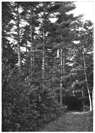 Yon group of spruce-trees, sidewise on the line
