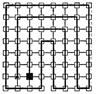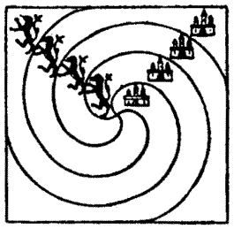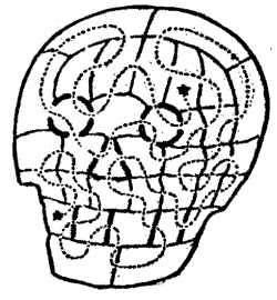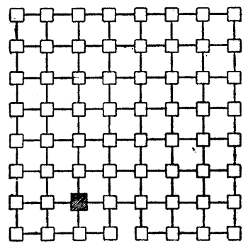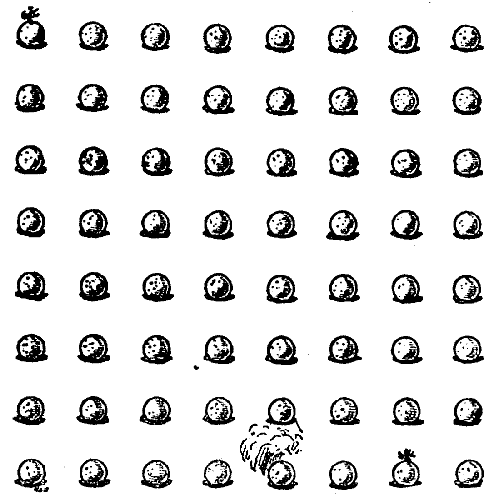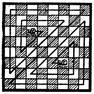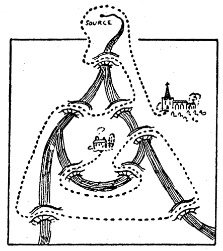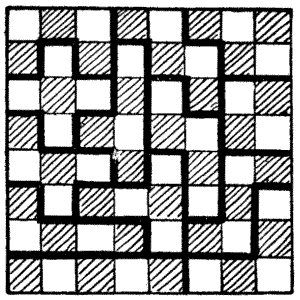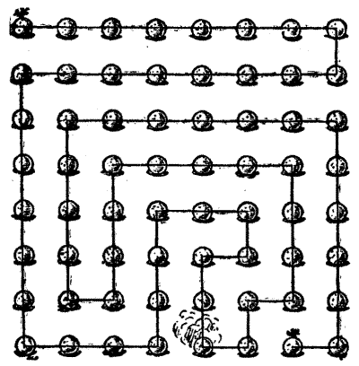 The gentle Pardoner, "that straight was come from the court of Rome," begged to be excused; but the company would not spare him. "Friends and fellow-pilgrims," said he, "of a truth the riddle that I have made is but a poor thing, but it is the best that I have been able to devise. Blame my lack of knowledge of such matters if it be not to your liking." But his invention was very well received. He produced the accompanying plan, and said that it represented sixty-four towns through which he had to pass[Pg 26] during some of his pilgrimages, and the lines connecting them were roads. He explained that the puzzle was to start from the large black town and visit all the other towns once, and once only, in fifteen straight pilgrimages. Try to trace the route in fifteen straight lines with your pencil. You may end where you like, but note that the omission of a little road at the bottom is intentional, as it seems that it was impossible to go that way.