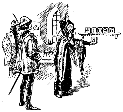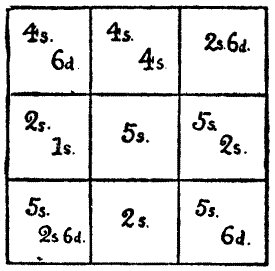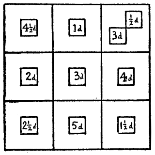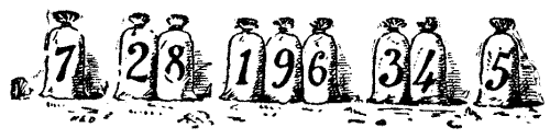 The Miller next took the company aside and showed them nine sacks of flour that were standing as depicted in the sketch. "Now, hearken, all and some," said he, "while that I do set ye the riddle of the nine sacks of flour. And mark ye, my lords and masters, that there be single sacks on the outside, pairs next unto them, and three together in the middle thereof. By Saint Benedict, it doth so happen that if we do but multiply the pair, 28, by the single one, 7, the answer is 196, which is of a truth the number shown by the sacks in the middle. Yet it be not true that the other pair, 34, when so multiplied by its neighbour, 5, will also make 196. Wherefore I do beg you, gentle sirs, so to place anew the nine sacks with as little trouble as possible that each pair when thus multiplied by its single neighbour shall make the number in the middle." As the Miller has stipulated in effect that as few bags as possible shall be moved, there is only one answer to this puzzle, which everybody should be able to solve.