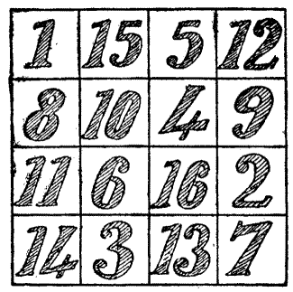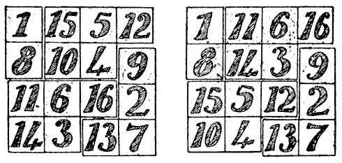 And there is really a practical utility in puzzle-solving. Regular exercise is supposed to be as necessary for the brain as for the body, and in both cases it is not so much what we do as the doing of it from which we derive benefit. The daily walk recommended by the doctor for the good of the body, or the daily exercise for the brain, may in itself appear to be so much waste of time; but it is the truest economy in the end. Albert Smith, in one of his amusing novels, describes a woman who was convinced that she suffered from "cobwigs on the brain." This may be a very rare[Pg 14] complaint, but in a more metaphorical sense many of us are very apt to suffer from mental cobwebs, and there is nothing equal to the solving of puzzles and problems for sweeping them away. They keep the brain alert, stimulate the imagination, and develop the reasoning faculties. And not only are they useful in this indirect way, but they often directly help us by teaching us some little tricks and "wrinkles" that can be applied in the affairs of life at the most unexpected times and in the most unexpected ways.