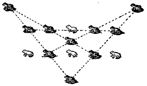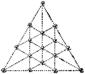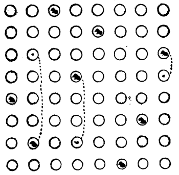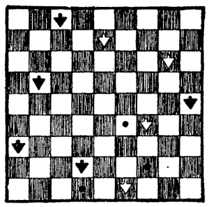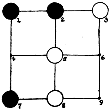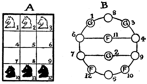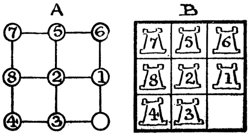 Sometimes a new and most interesting idea is suggested by the[Pg 15] blunder of somebody over another puzzle. A boy was given a puzzle to solve by a friend, but he misunderstood what he had to do, and set about attempting what most likely everybody would have told him was impossible. But he was a boy with a will, and he stuck at it for six months, off and on, until he actually succeeded. When his friend saw the solution, he said, "This is not the puzzle I intended—you misunderstood me—but you have found out something much greater!" And the puzzle which that boy accidentally discovered is now in all the old puzzle books.