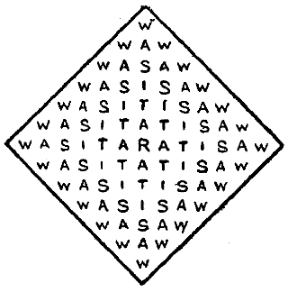 There is the large class of Letter Puzzles, which are based on[Pg 17] the little peculiarities of the language in which they are written—such as anagrams, acrostics, word-squares, and charades. In this class we also find palindromes, or words and sentences that read backwards and forwards alike. These must be very ancient indeed, if it be true that Adam introduced himself to Eve (in the English language, be it noted) with the palindromic words, "Madam, I'm Adam," to which his consort replied with the modest palindrome "Eve."