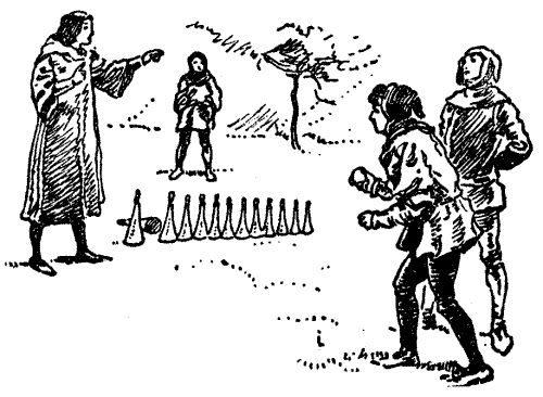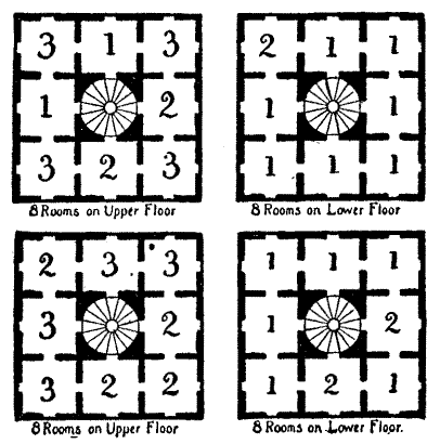 The Reve was a wily man and something of a scholar. As Chaucer tells us, "There was no auditor could of him win," and "there could no man bring him in arrear." The poet also noticed that "ever he rode the hindermost of the route." This he did that he might the better, without interruption, work out the fanciful problems and ideas that passed through his active brain. When the pilgrims were stopping at a wayside tavern, a number of cheeses of varying sizes caught his alert eye; and calling for four stools, he told the company that he would show them a puzzle of his own that would keep them amused during their rest. He then placed eight cheeses of graduating sizes on one of the end stools, the smallest cheese being at the top, as clearly shown in the illustration. "This is a riddle," quoth he, "that I did once set before my fellow townsmen at Baldeswell, that is in Norfolk, and, by Saint Joce, there was[Pg 25] no man among them that could rede it aright. And yet it is withal full easy, for all that I do desire is that, by the moving of one cheese at a time from one stool unto another, ye shall remove all the cheeses to the stool at the other end without ever putting any cheese on one that is smaller than itself. To him that will perform this feat in the least number of moves that be possible will I give a draught of the best that our good host can provide." To solve this puzzle in the fewest possible moves, first with 8, then with 10, and afterwards with 21 cheeses, is an interesting recreation.